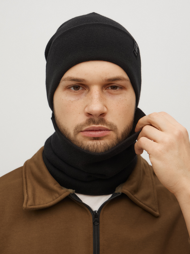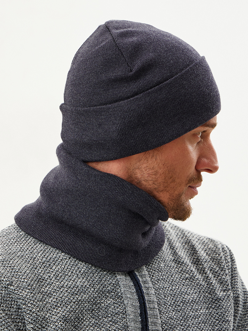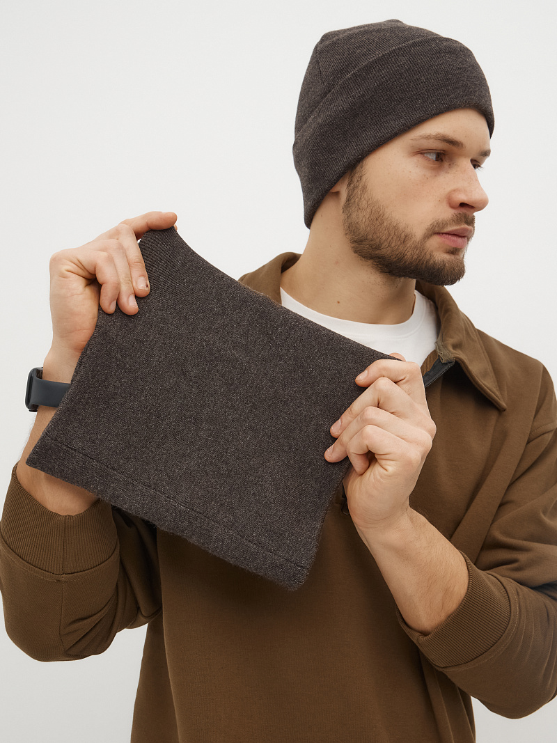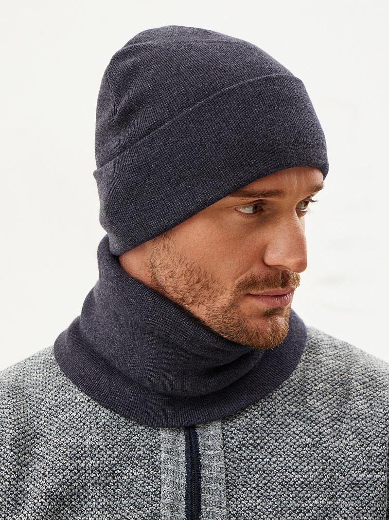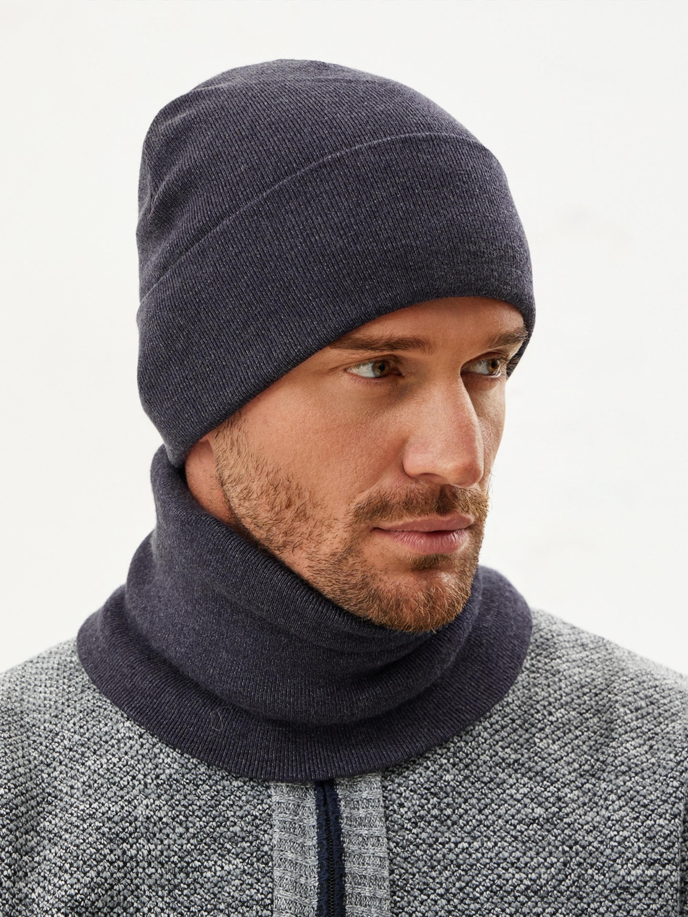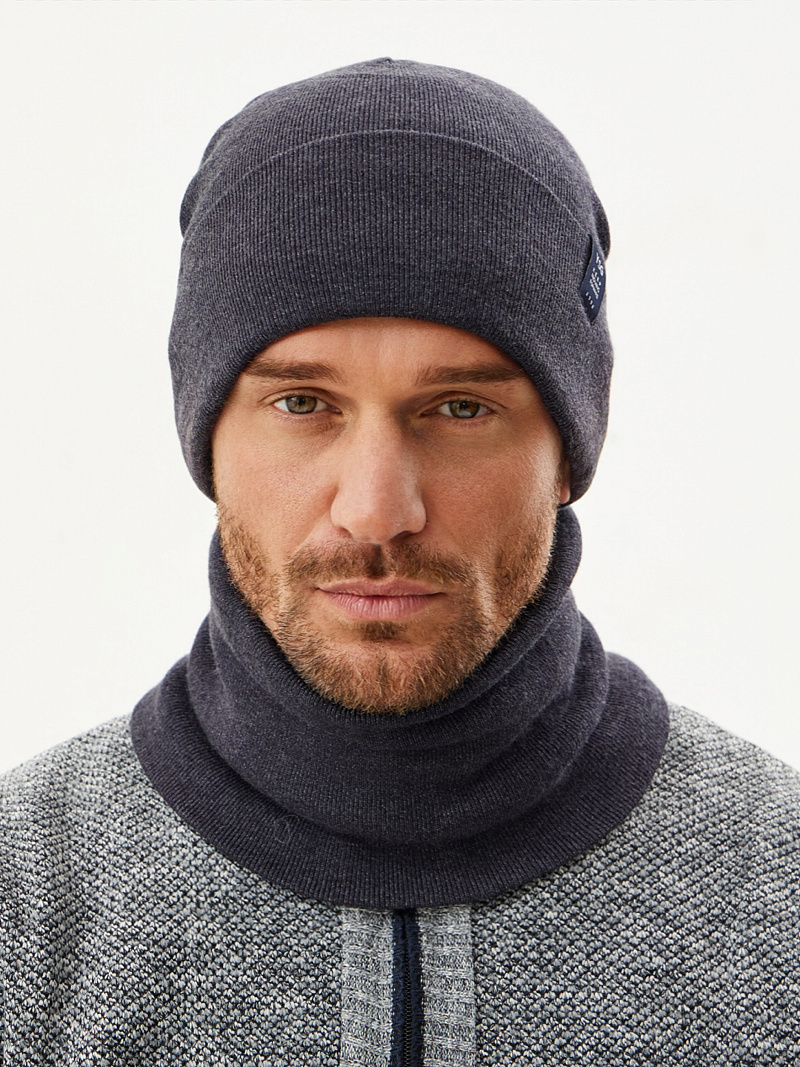 Классический осенне - зимний мужской комплект двойной с кашемиром. Шапка + удобный снуд-труба.
