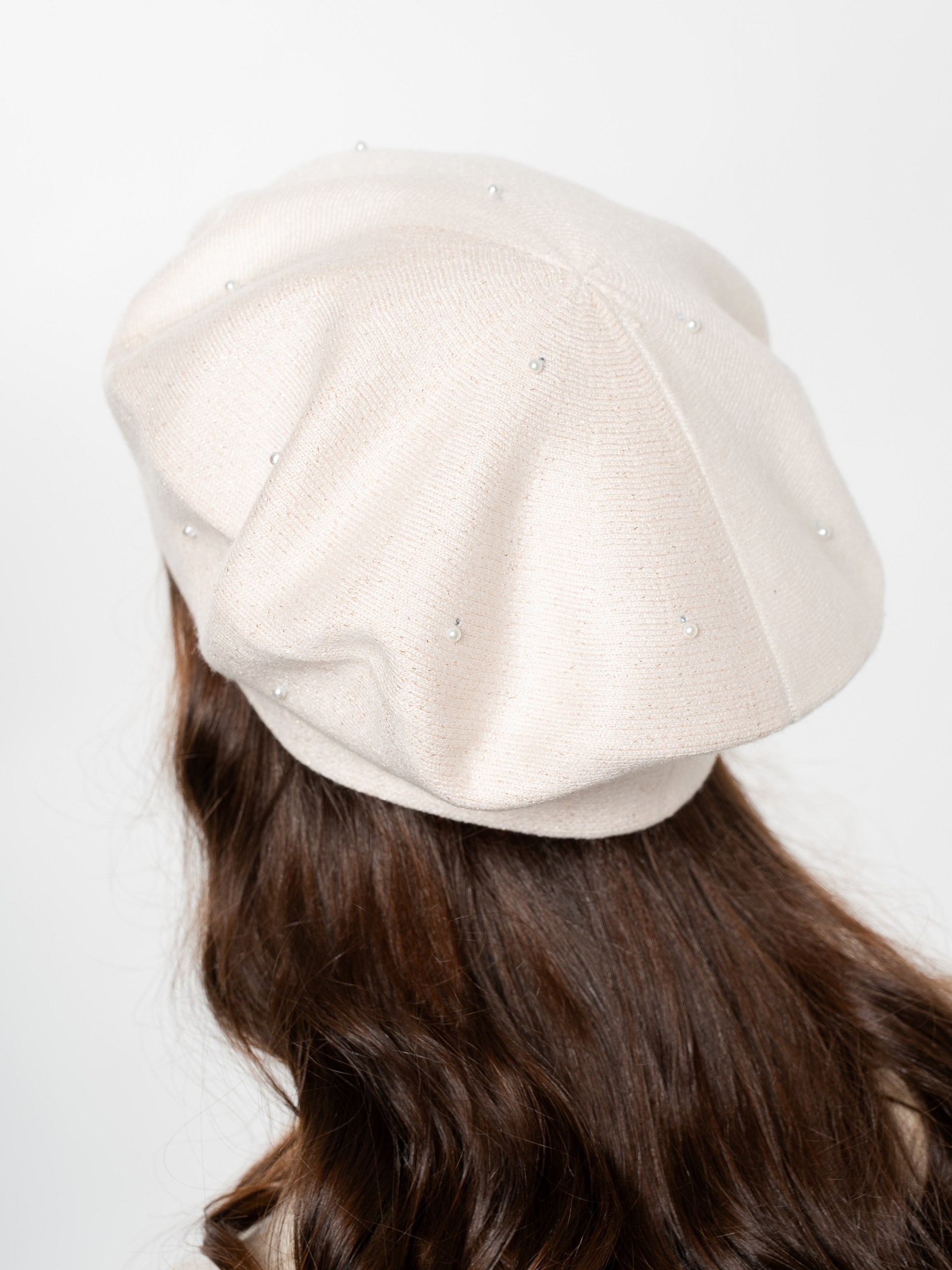 Берет полуторный двухцветный с люрексом, со стразовым мотивом и жемчугом