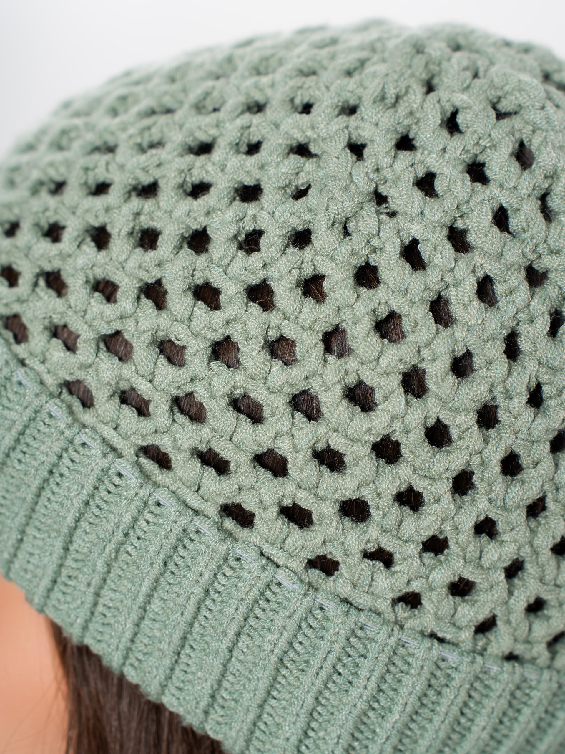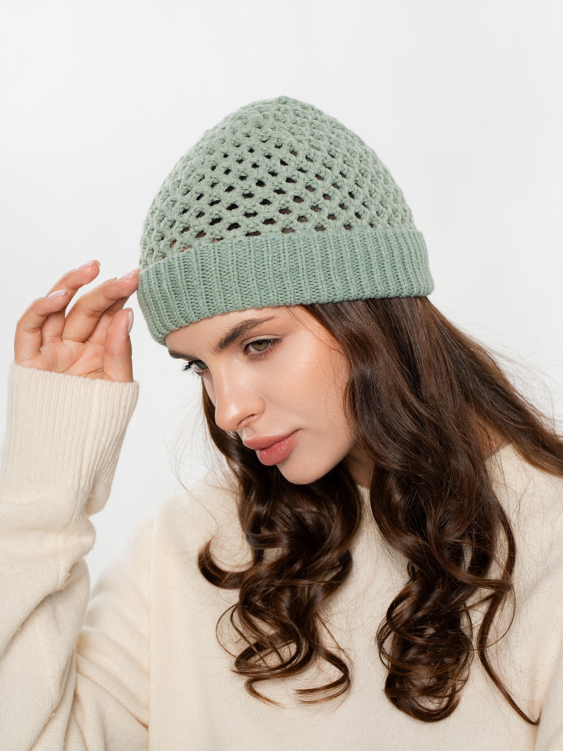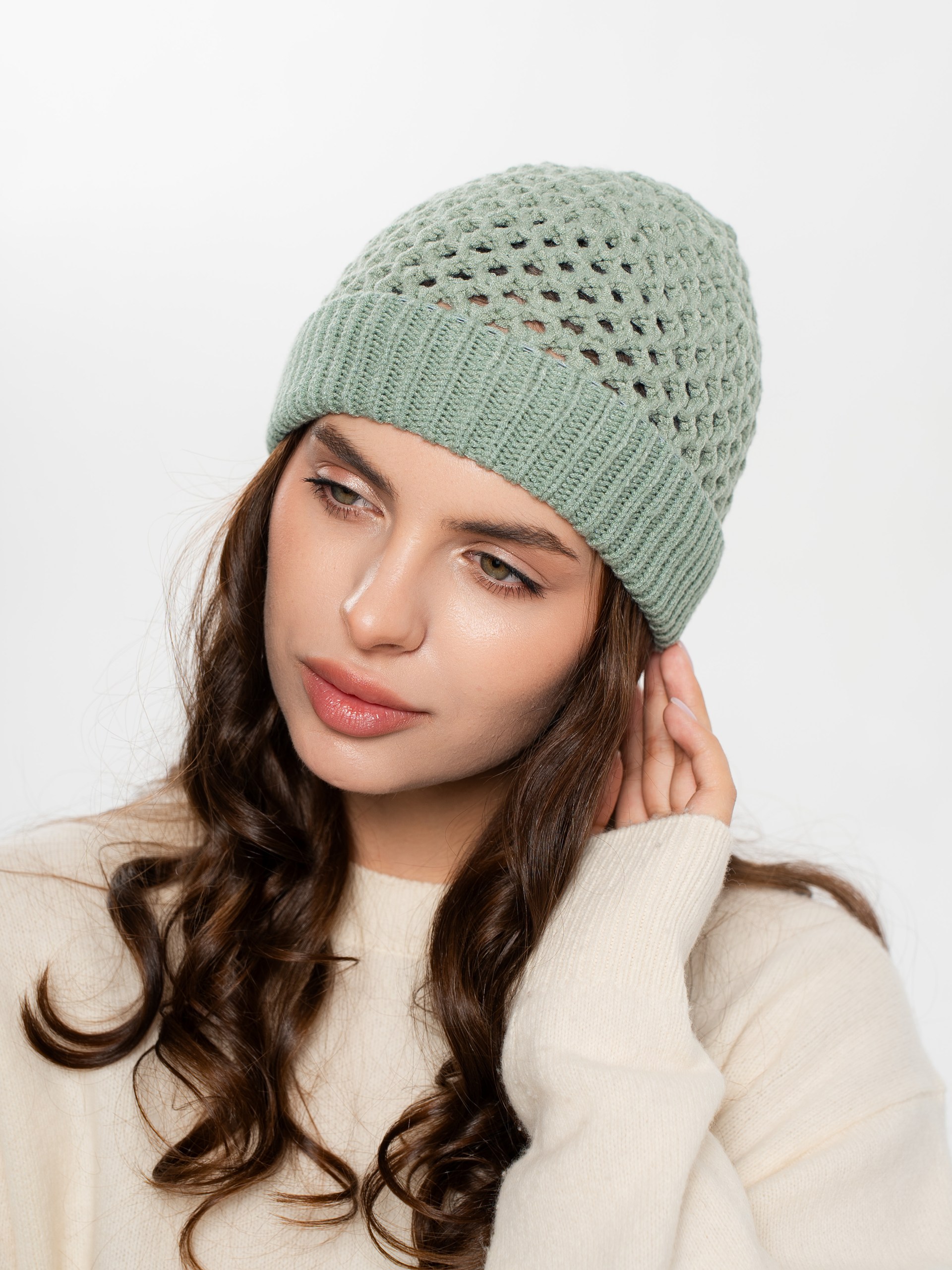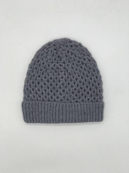 Шапка однослойная из ажурной вязки, с отворотом