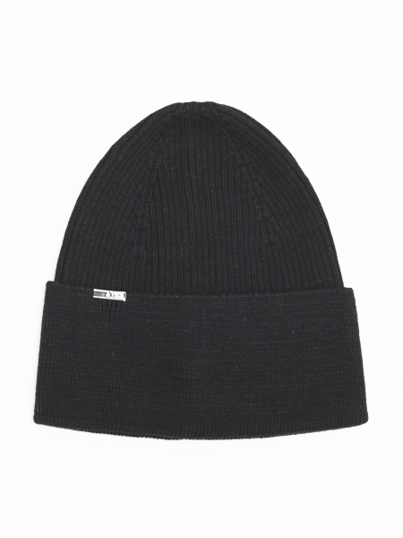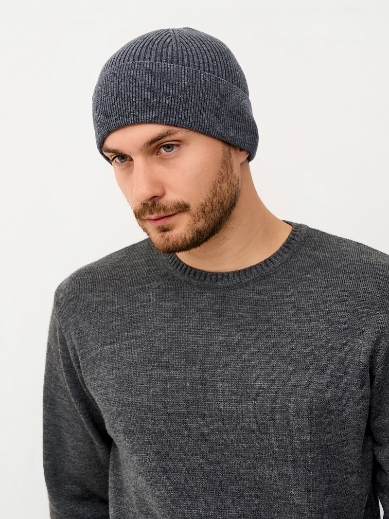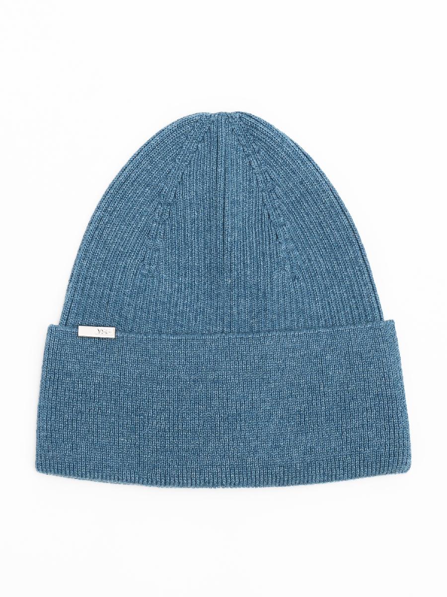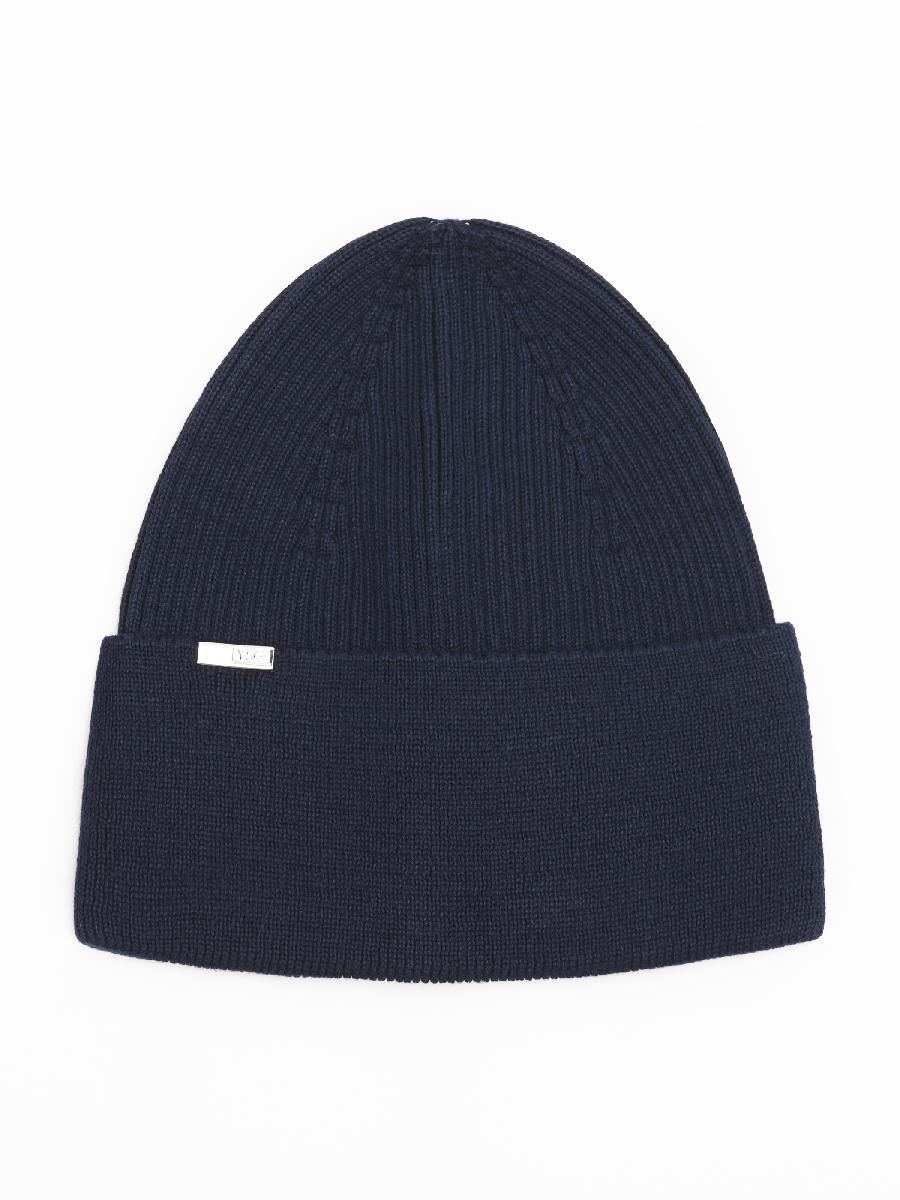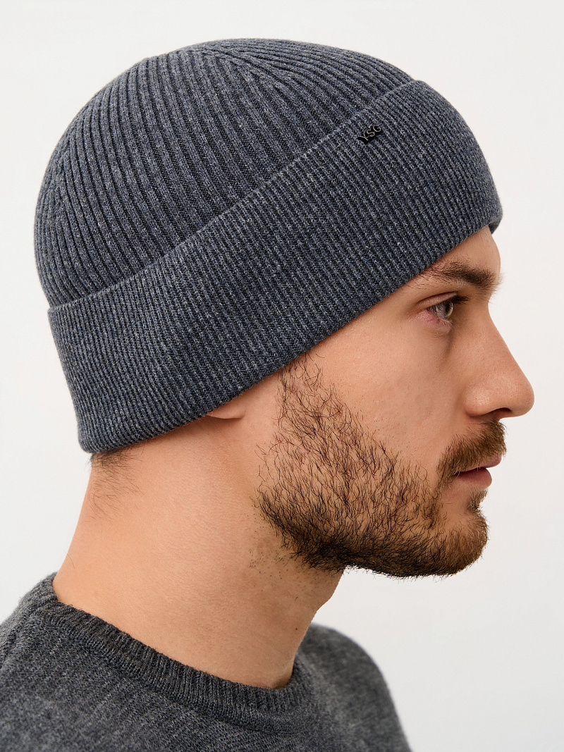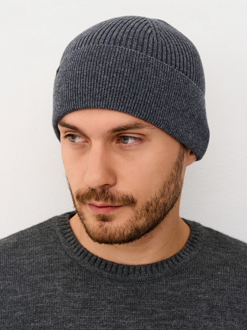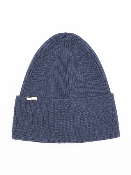 Шапка одинарная с хлопком, с отворотом и металлическим декором.