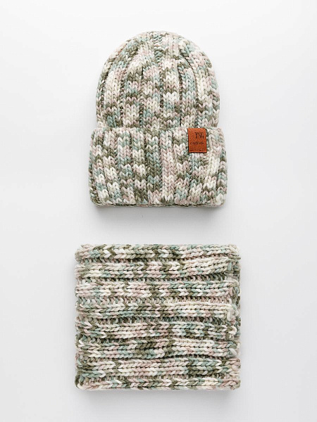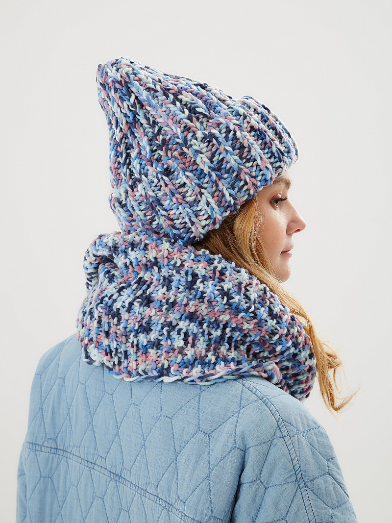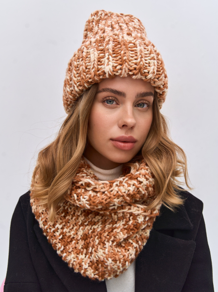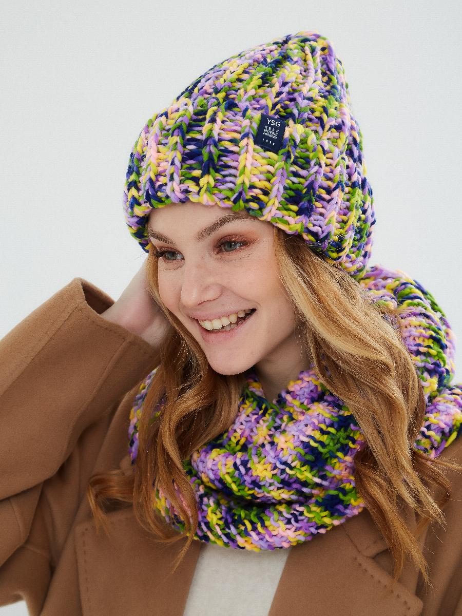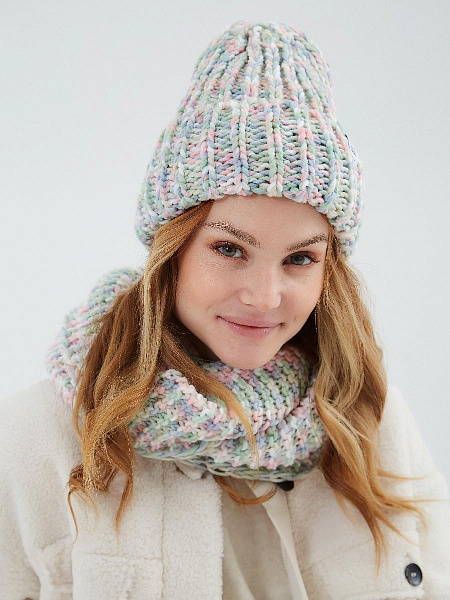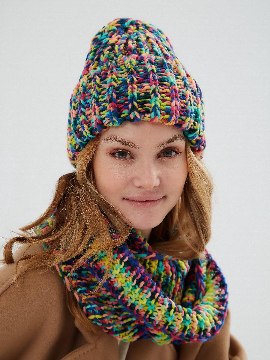 Комплект с шерстью на флисе. Шапка и снуд из разноцветной пряжи. Продажи прошлых сезонов показали привлекательность модели. Добавляйте в свой ассортимент модели с изюминкой, удивляйте покупателей.