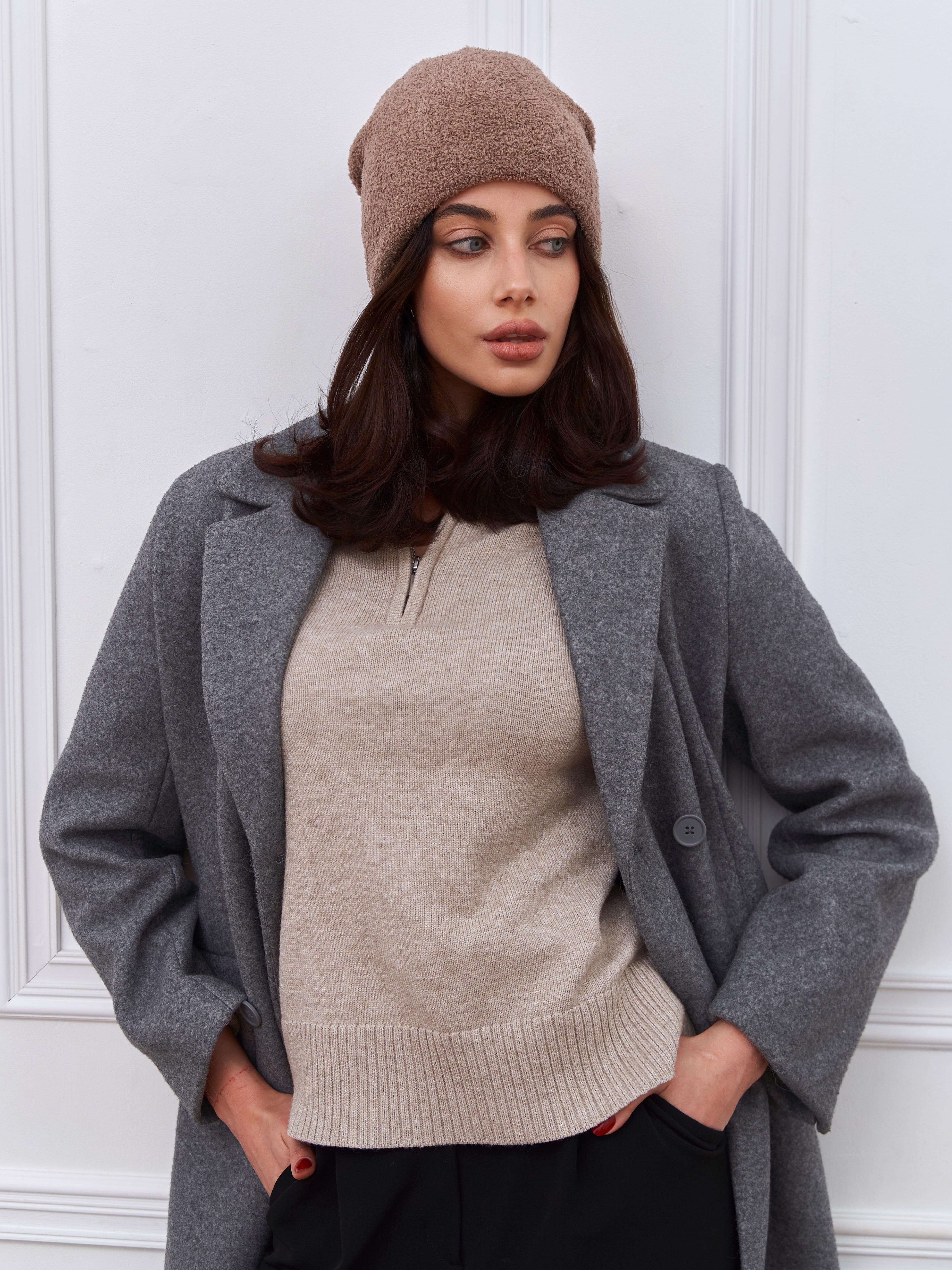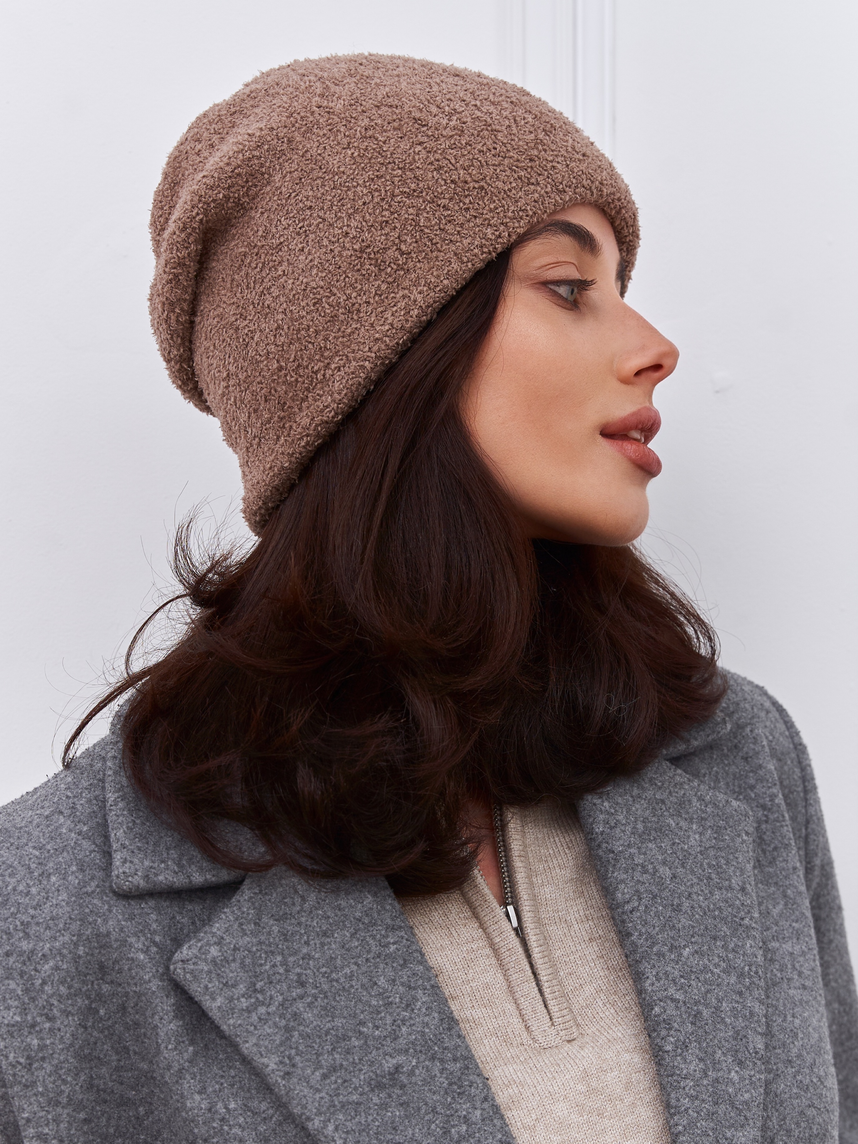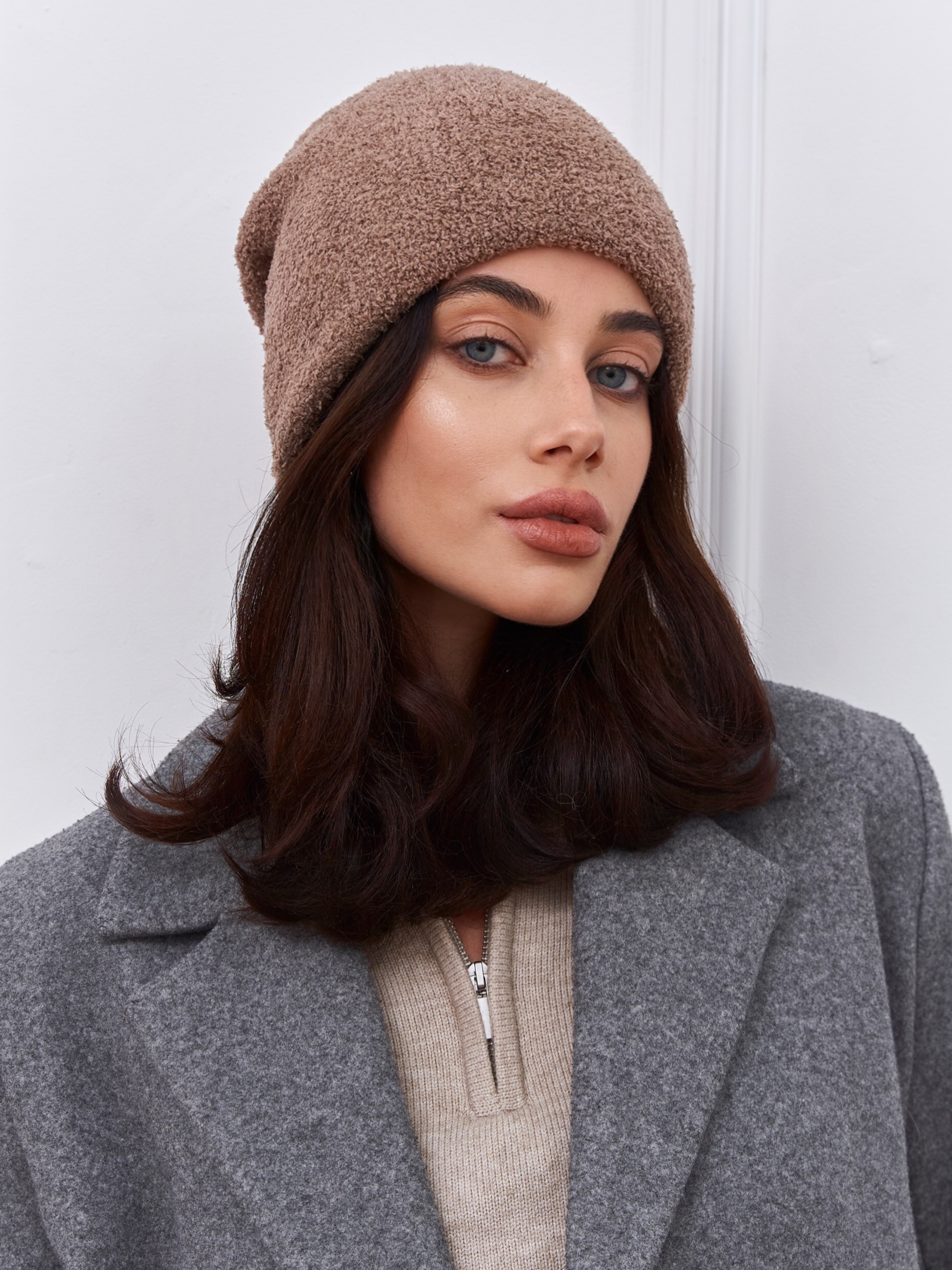 Шапка двойная с шерстью мериноса, сзади с защипом. Плюш