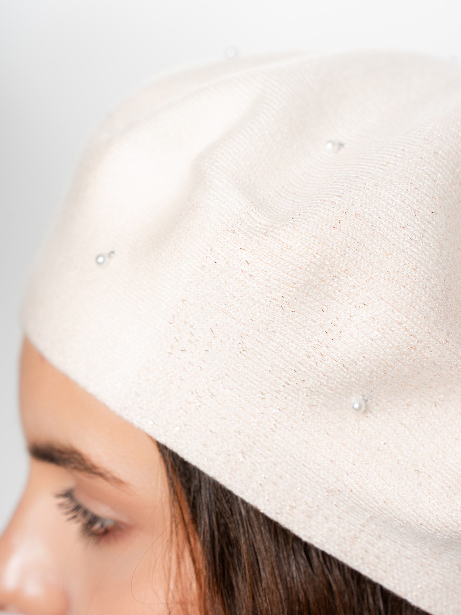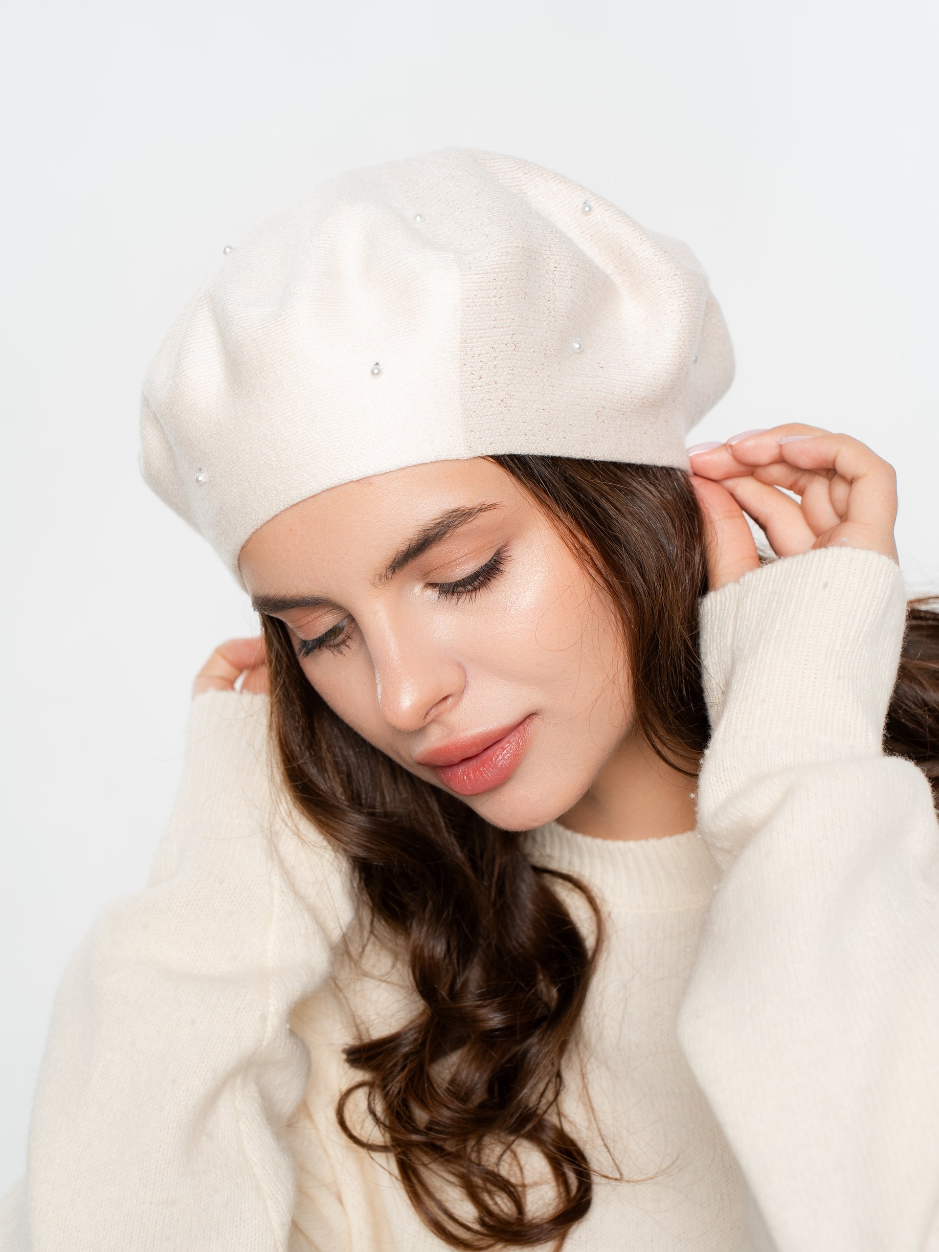 Берет полуторный двухцветный с люрексом, со стразовым мотивом и жемчугом