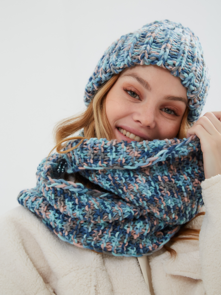 Комплект с шерстью на флисе. Шапка и снуд из разноцветной пряжи. Продажи прошлых сезонов показали привлекательность модели. Добавляйте в свой ассортимент модели с изюминкой, удивляйте покупателей.