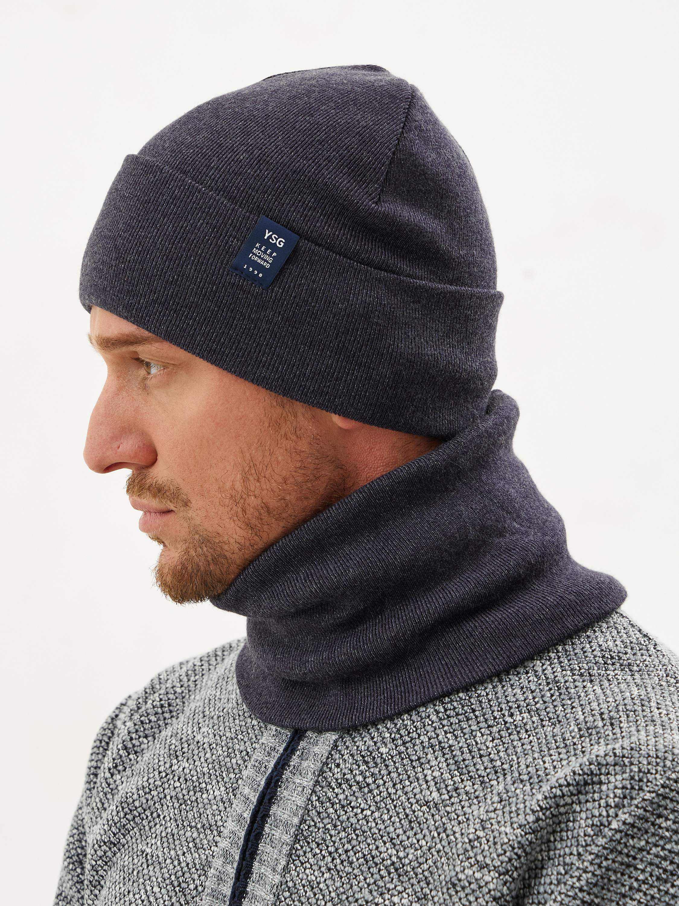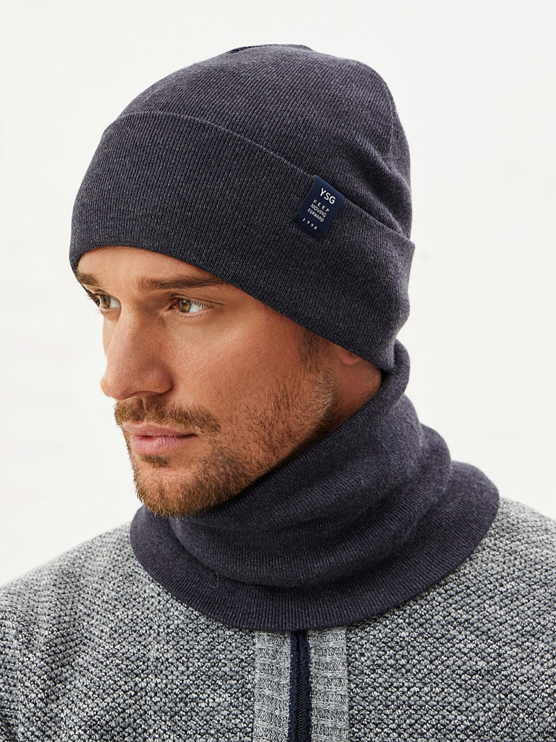 Классический осенне - зимний мужской комплект двойной с кашемиром. Шапка + удобный снуд-труба.