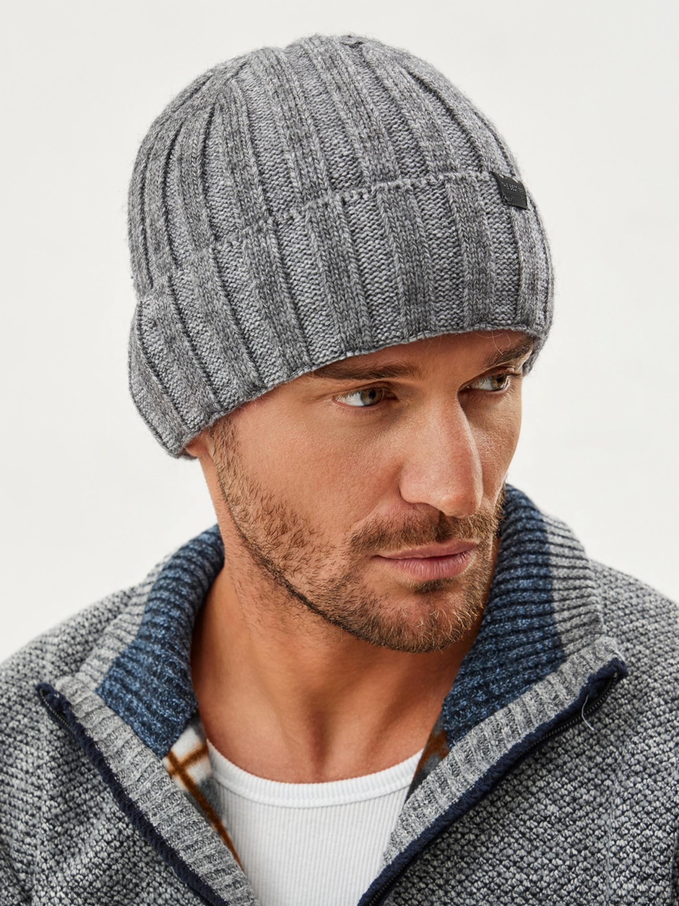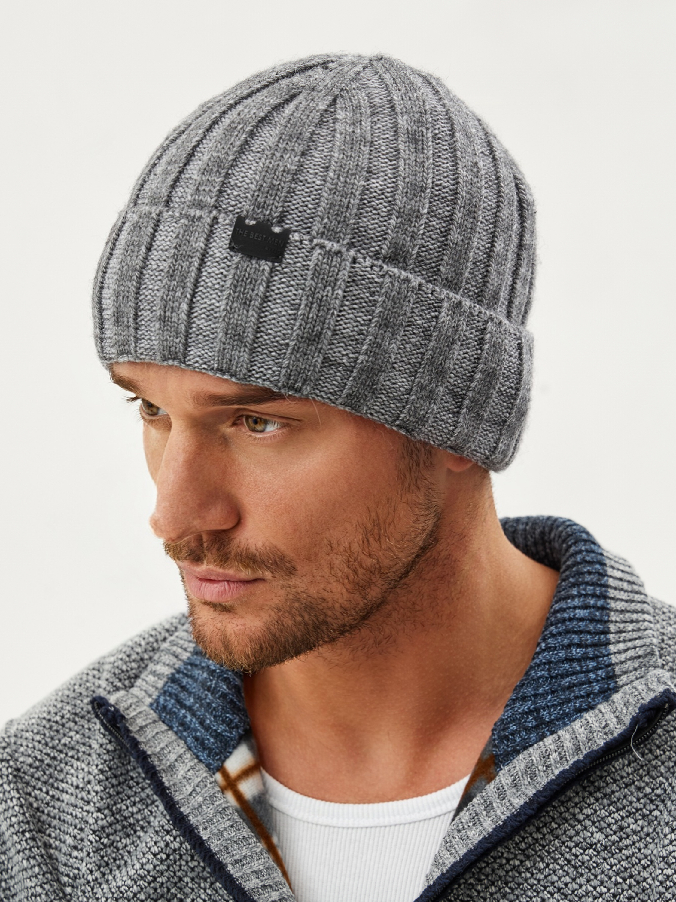 Шапка на флисе с ангорой, двухцветная, с отворотом, с кожаным декором.