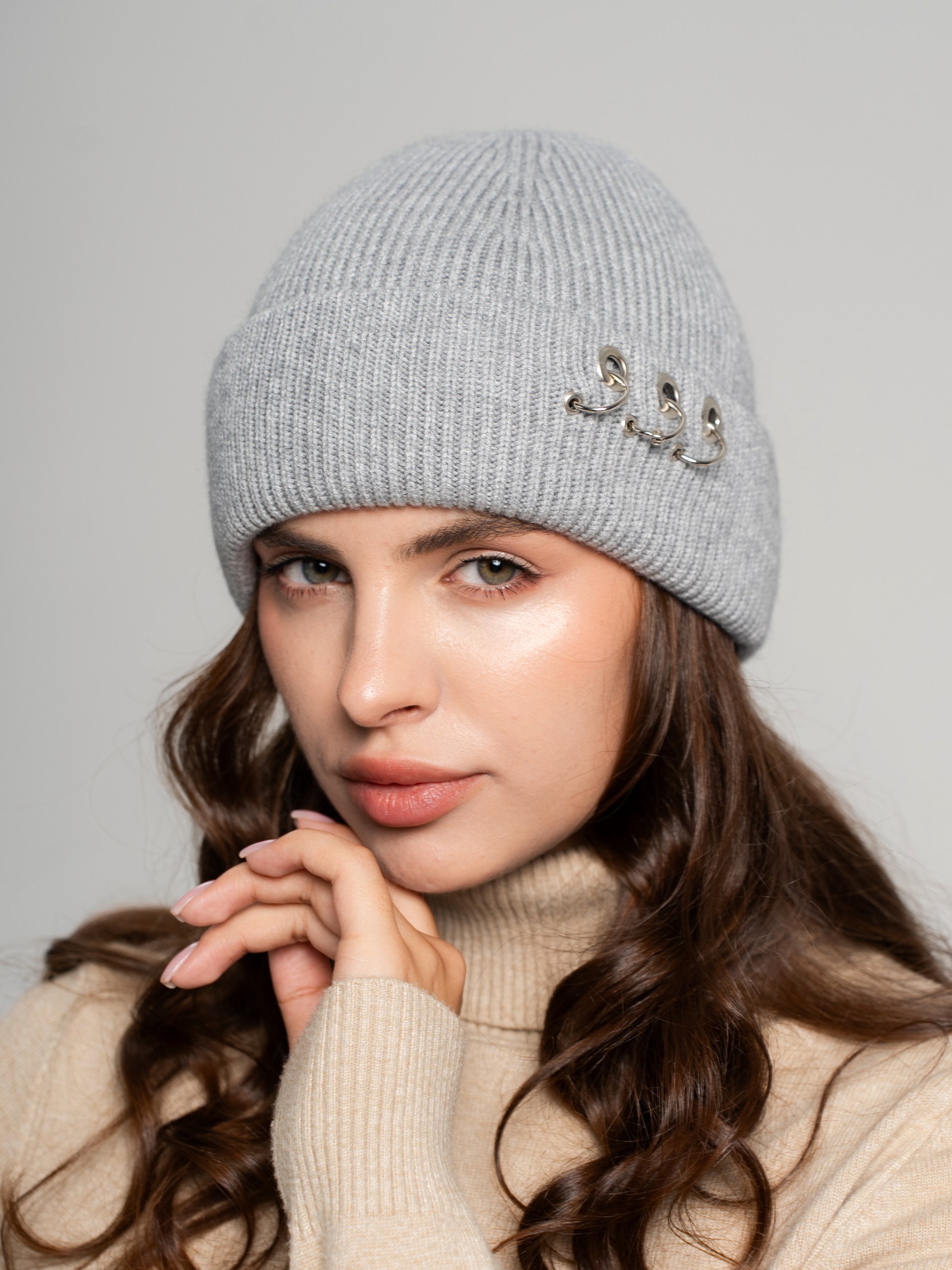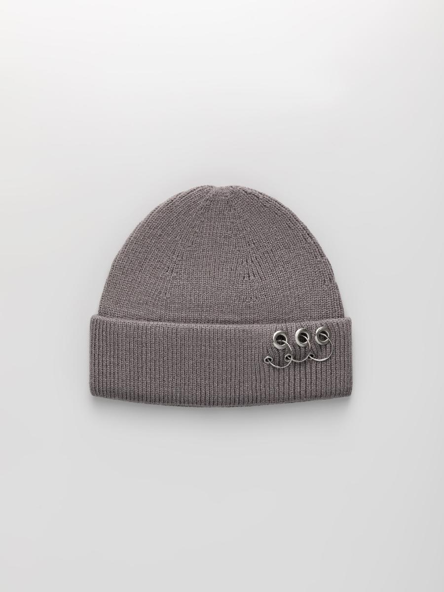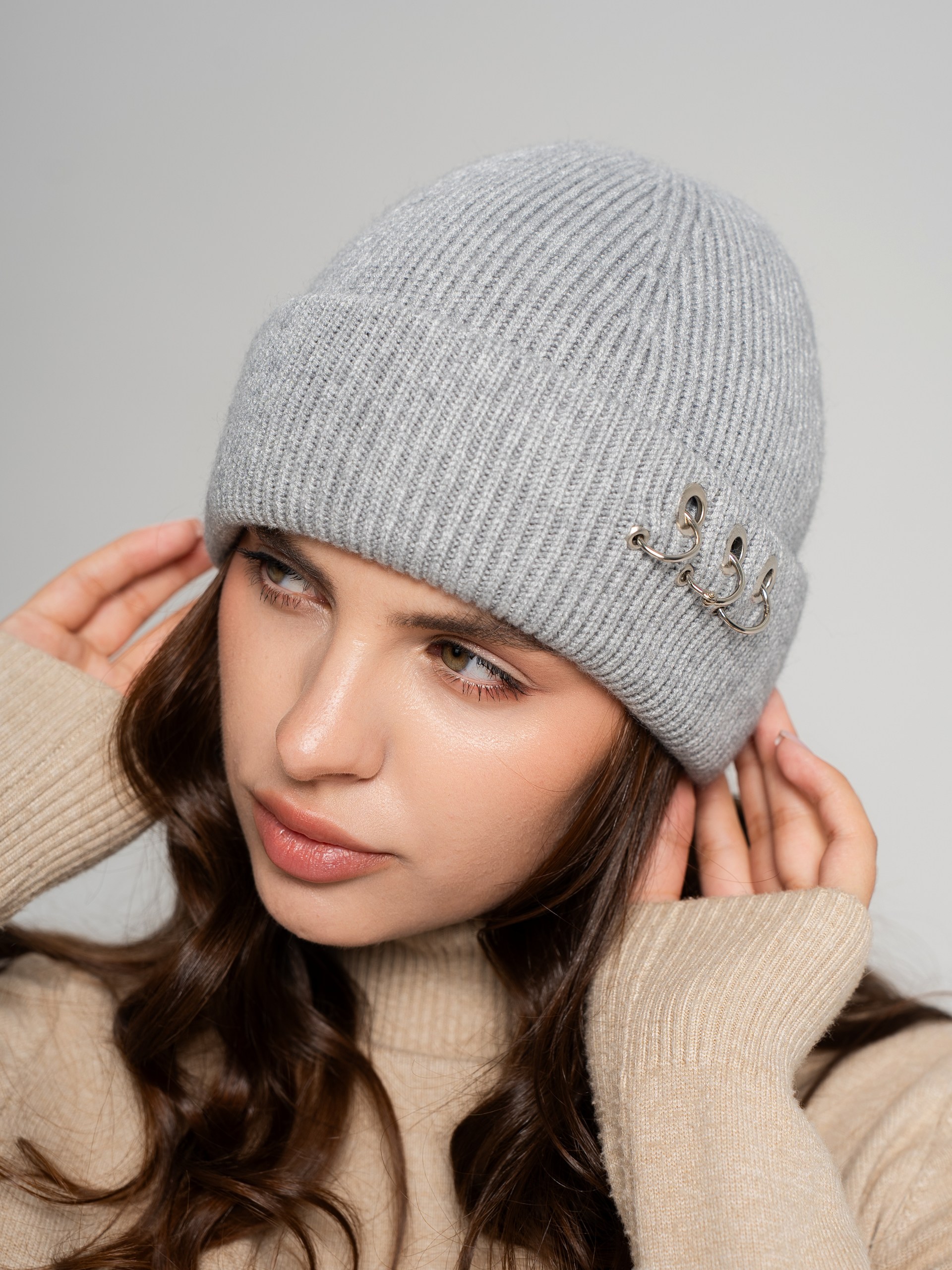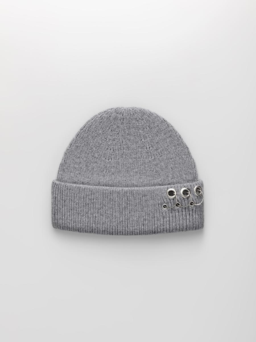 Шапка одинарная с кашемиром с подворотом. Украшена люверсами и кольцами.