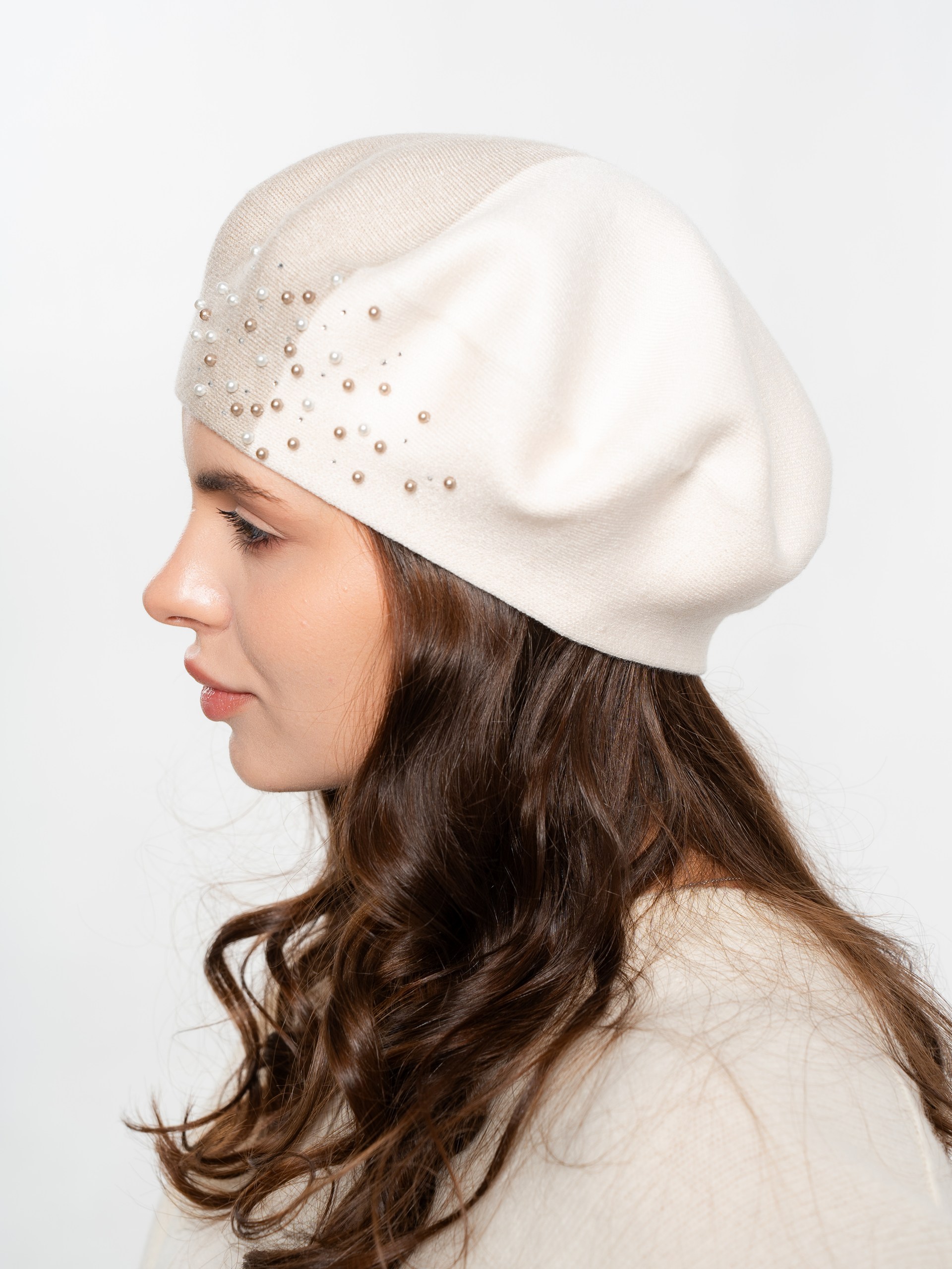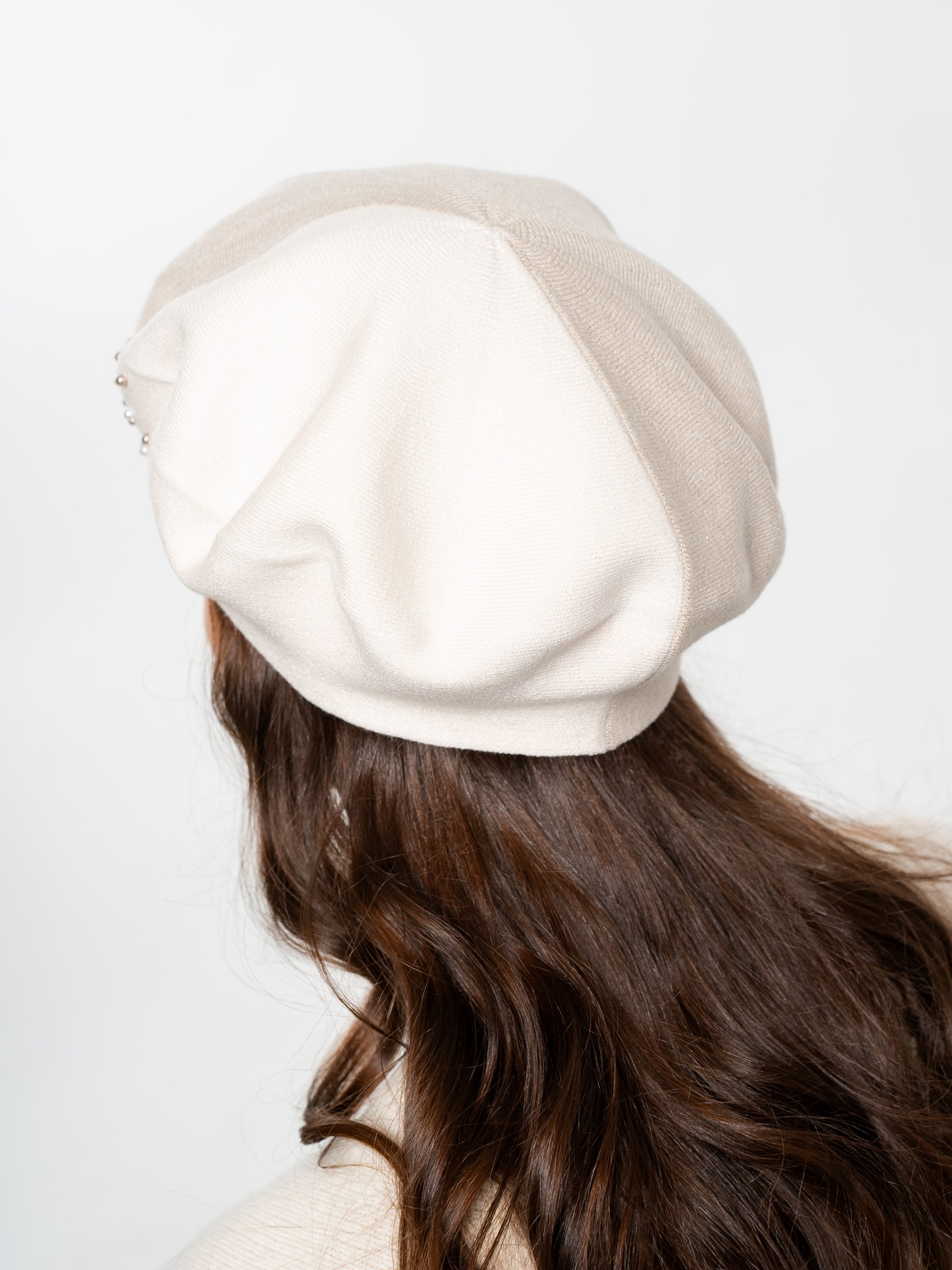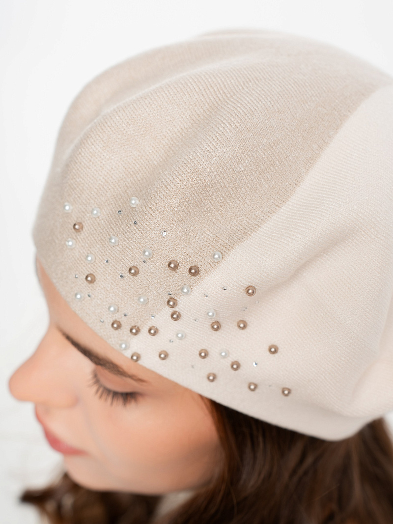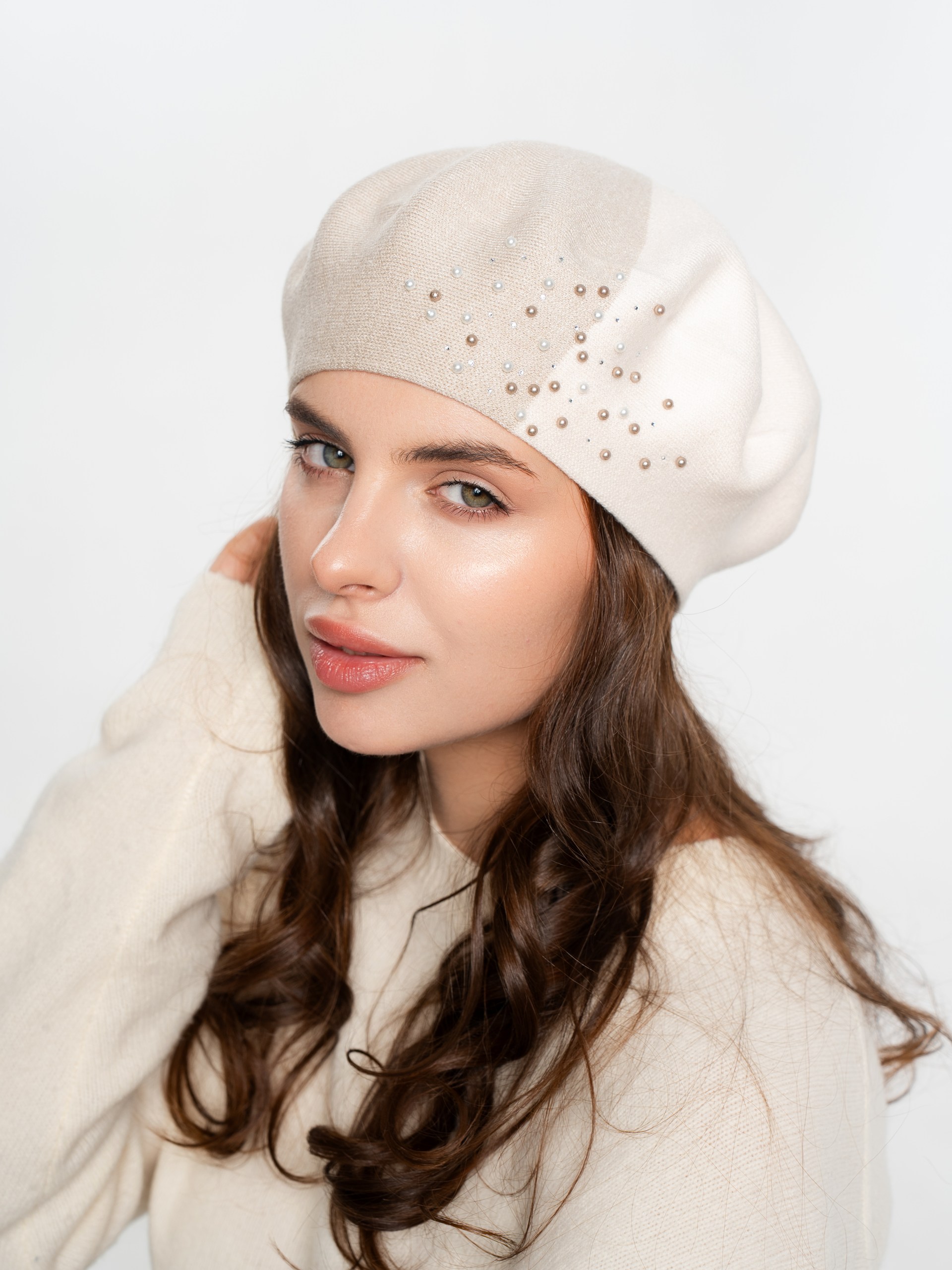 Берет полуторный двухцветный, со стразовым мотивом и жемчугом