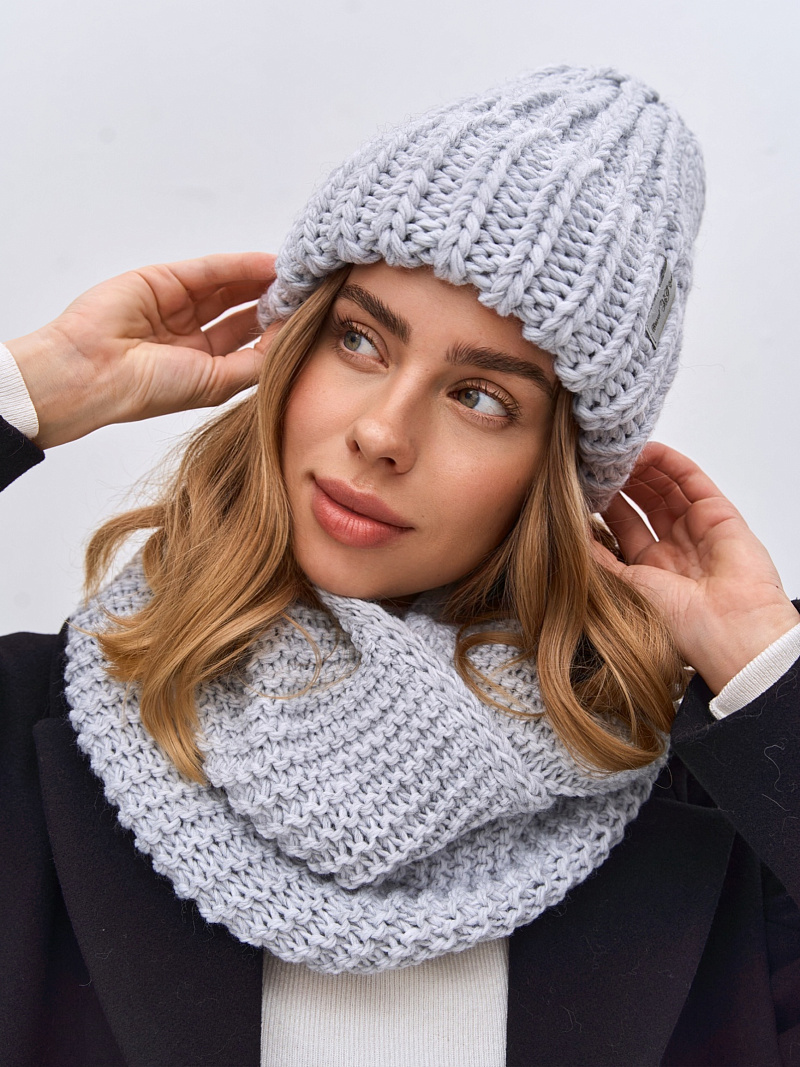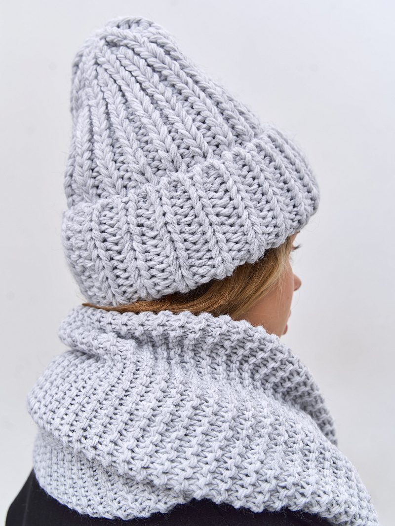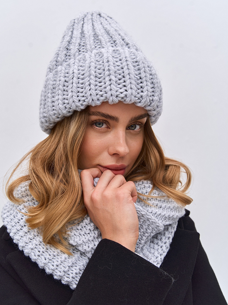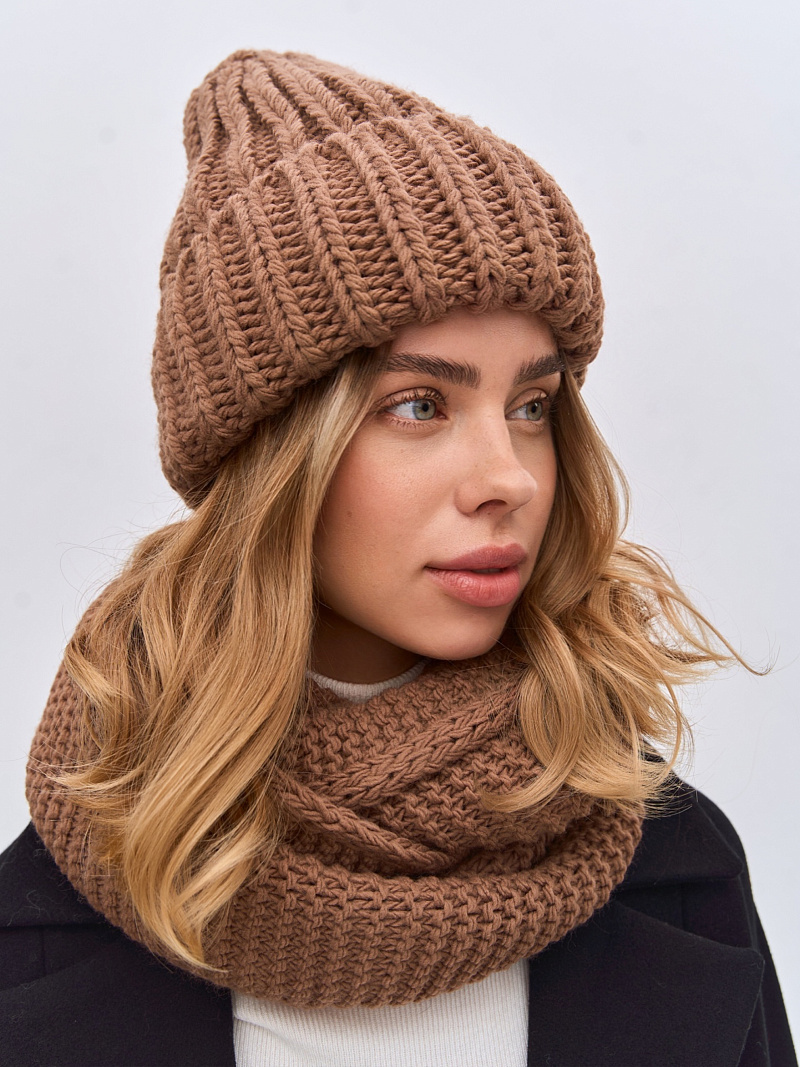 Комплект с шерстью на флисе крупной вязки в который входит снуд и шапка. Шапка крупной вязки с подкладкой из флиса, идеальное решение на холодную зиму. Объемный шарф-снуд можно носить как на шее, так и на голове вместо головного убора. Хит продаж!