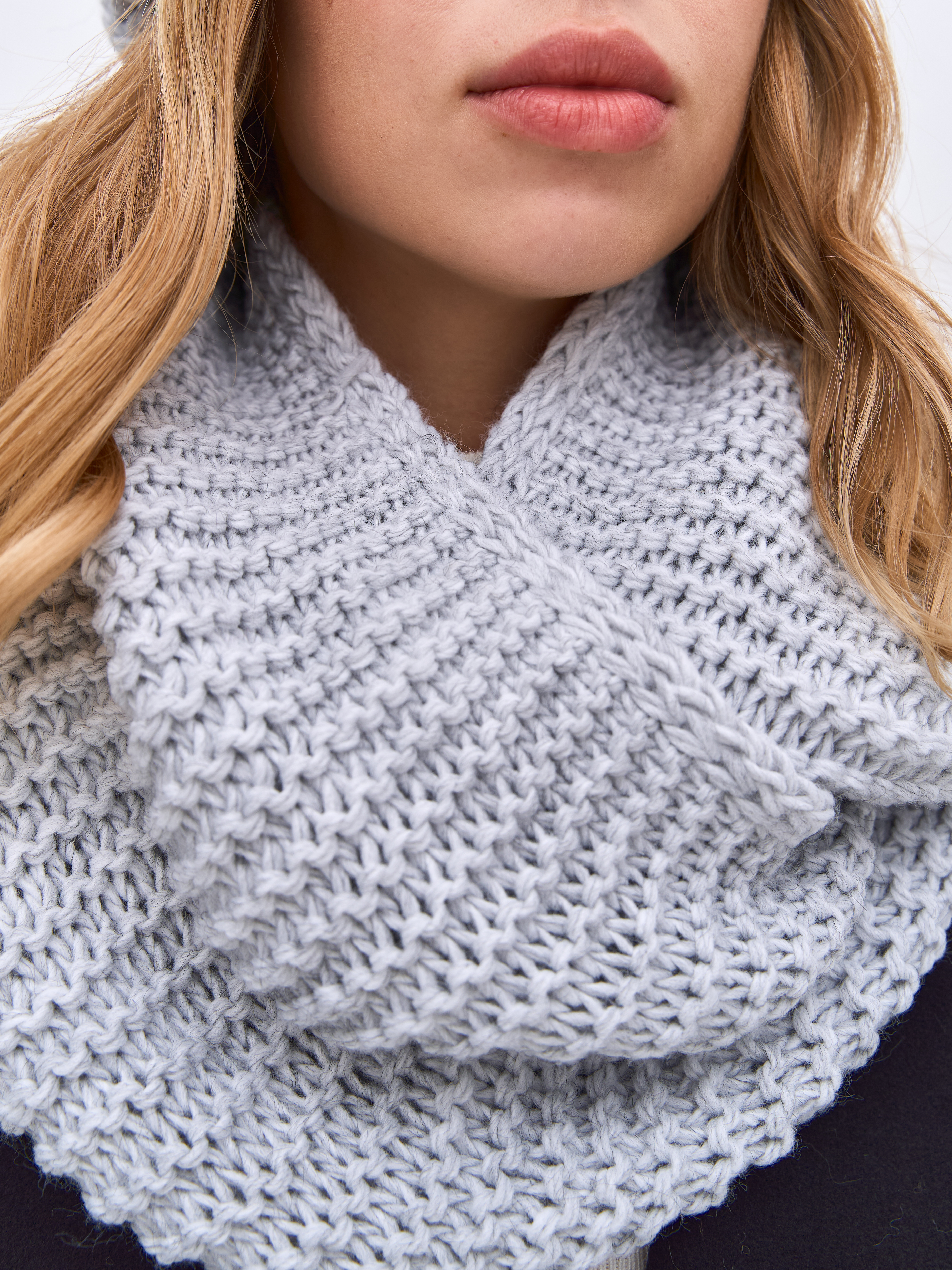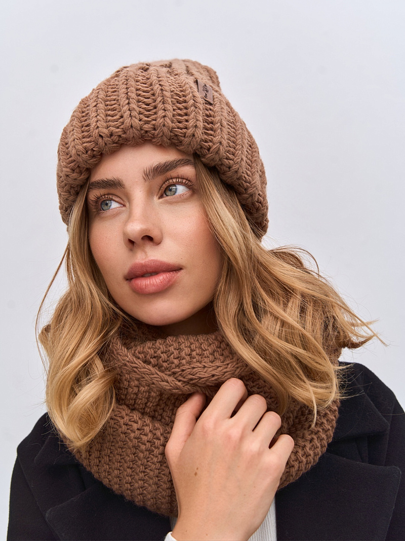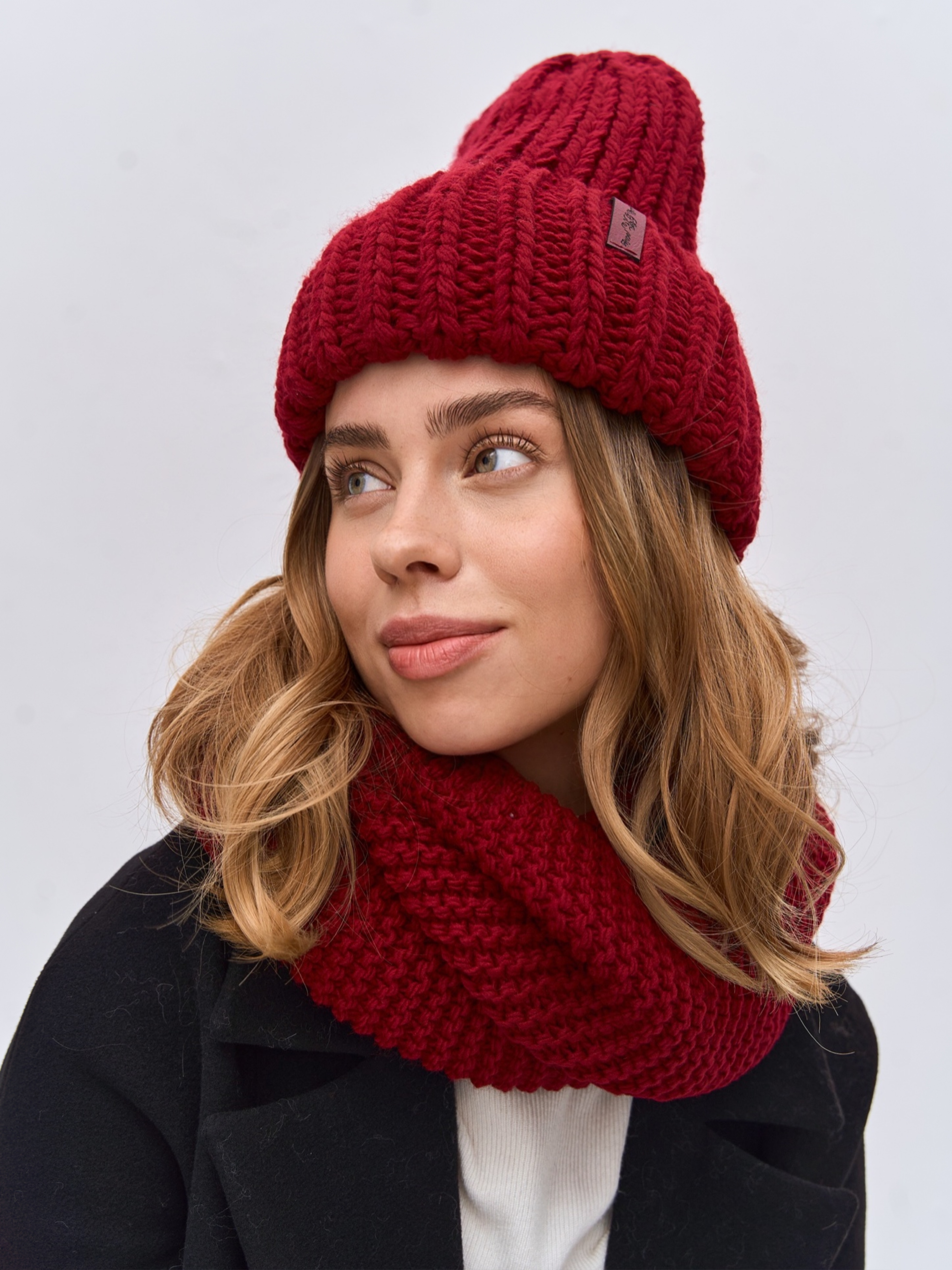 Комплект с шерстью на флисе крупной вязки в который входит снуд и шапка. Шапка крупной вязки с подкладкой из флиса, идеальное решение на холодную зиму. Объемный шарф-снуд можно носить как на шее, так и на голове вместо головного убора. Хит продаж!